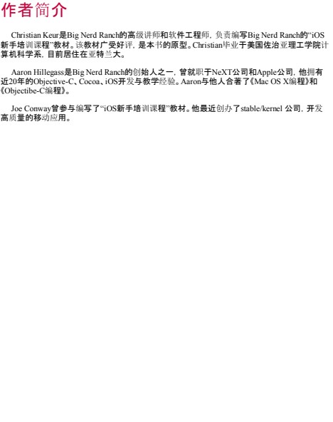 ios编程第4版是一本ios编程开发教学手册,由美国程序员Christian Keur、Aaron Hillegass和Joe Conway三人共同编著。本书涵盖了iOS应用开发的必备知识,主要讲解了从Objective-C基础知识到新语言特性,从AppKit库到常见的Cocoa设计模式,从Xcode技巧到Instruments,不一而足,可以更好的指导读者以正确的方法解决问题,适用于iPhone、iPad应用程序开发者,欢迎免费下载读。