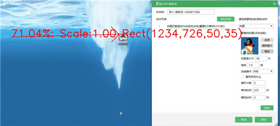 第一个值71.04%即匹配度,您设置的匹配度一定要比这个略小,比如上图,如果我将匹配度设置为80%, 那么将会找不到, 设置为70%则可成功;第二个值是缩放系数, 默认设置为1.0,第三个值是找到的矩形左上角坐标和高宽。