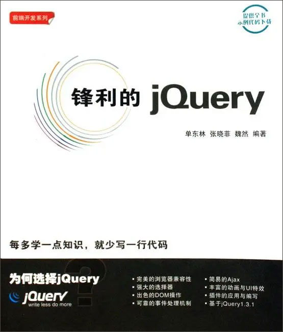 jquery是继prototype之后又一个优秀的javascript库,凭借简洁的语法和跨平台的兼容性,极大地简化了javascript开发人员遍历html文档、操作dom、处理事件、执行动画和开发ajax的操作。本次小编带来的是锋利的jquery pdf下载,该书由单东林、张晓菲、魏然编著,详细介绍了jQuery的各种函数和方法调用,并附带了相应的源码。全书尽是介绍javascript,源代码例证很不错,浅学易懂,讲的不深,适合入门,对初学者帮助相当大,是jquery入门的好教程。