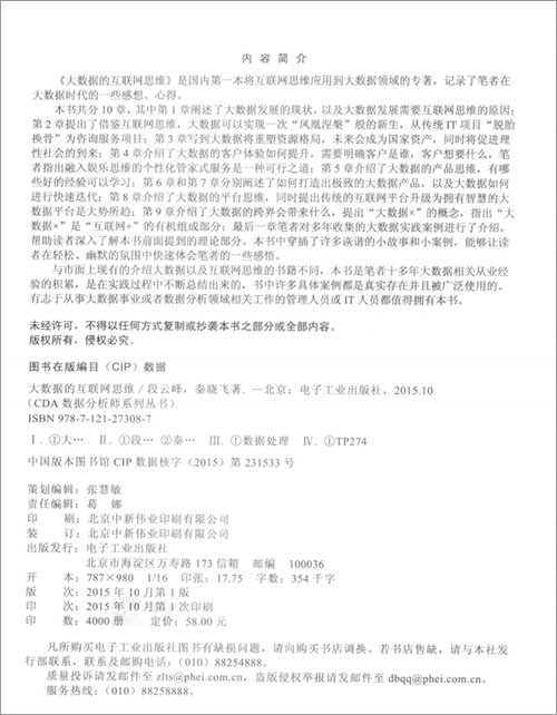 与市面上现有的介绍大数据以及互联网思维的书籍不同,《大数据的互联网思维是笔者十多年大数据相关从业经验的积累,是在实践过程中不断总结出来的,书中许多具体案例都是真实存在并且被广泛使用的。有志于从事大数据事业或者数据分析领域相关工作的管理人员或IT人员都值得拥有。