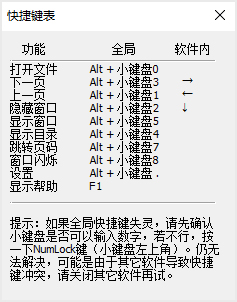 在主界面或设置界面按F1,可显示快捷键操作帮助。