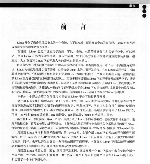 第一篇 Linux和C编程基础 第1章 Linux系统概述 1.1 Linux操作系统介绍 1.1.1 Linux的发展历程 1.1.2 Linux的特性 1.1.3 Linux的内核版本和发行版本 1.2 C语言简介 1.2.1 C语言的发展历史 1.2.2 C语言的特点 1.3 Linux的安装、启动与关闭 1.4 Linux的基本使用 1.4.1 Linux终端 1.4.2 Linux Shell 1.4.3 Linux的常用命令 1.5 Linux下程序的开发环境和开发过程 1.6 习题 第2章 C编程基础、Vi和Emacs编辑器 2.1 C程序的结构 2.2 C语言的基本数据类型 2.2.1 整型 2.2.2 浮点型 2.2.3 字符型 2.3 运算符和表达式 2.3.1 算术运算符与算术表达式 2.3.2 赋值运算符与赋值表达式 2.3.3 逗号运算符与逗号表达式 2.4 标准输入输出函数 2.4.1 字符输出函数putchar 2.4.2 字符输入函数getchar 2.4.3 格式化输出函数printf 2.4.4 格式化输入函数scanf 2.5 Vi编辑器的使用 2.5.1 Vi的工作模式 2.5.2 启动Vi 2.5.3 保存文件和退出Vi 2.5.4 光标的移动 2.5.5 文本的删除 2.5.6 文本查找和替换 2.5.7 文本的复制与粘贴 2.6 Emacs编辑器的使用 2.7 命名规范 2.7.1 标识符 2.7.2 关键字 2.7.3 命名规范 2.8 面试题选与实例精讲 2.8.1 面试题选 2.8.2 实例精讲 2.9 习题 第3章 C程序控制结构和gcc编译器 3.1 C程序的控制结构 3.1.1 C程序语句概述 3.1.2 C程序的3种基本控制结构 3.2 分支控制结构 3.2.1 关系运算符与关系表达式 3.2.2 逻辑运算符与逻辑表达式 3.2.3 if语句 3.2.4 switch语句 3.3 循环控制结构 3.3.1 while语句 3.3.2 do…while语句 3.3.3 for语句 3.3.4 break语句和continue语句 3.4 gcc编译器 3.4.1 程序的编译过程 3.4.2 gcc的常用选项 3.4.3 gcc的报错类型及对策 3.5 面试题选与实例精讲 3.5.1 面试题选 3.5.2 实例精讲 3.6 习题 第4章 C函数、数组、指针和调试器gdb 第5章 C语言预处理、结构体和make的使用 第二篇 Linux系统编程 第6章 文件操作 第7章 进程控制 第8章 线程控制 第9章 信号及信号处理 第10章 进程间通信 第三篇 Linux网络和图形界面编程 第11章 网络编程 第12章 GTK+图形界面编程 第四篇 Linux项目实践 第13章 项目实践:BT下载软件的开发