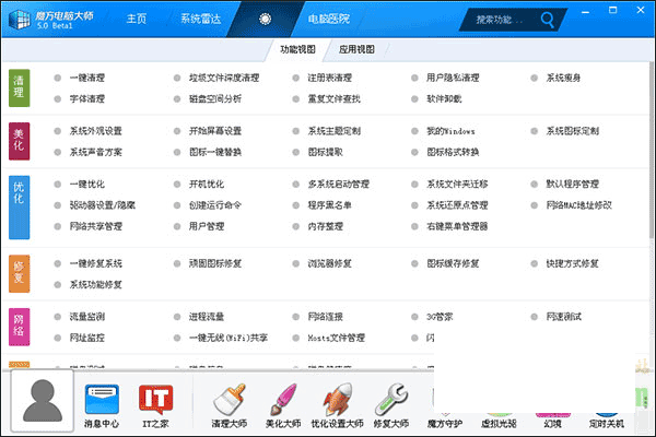 包括Windows系统清理、美化、优化、修复、网络、磁盘、文件、IE、工具等。