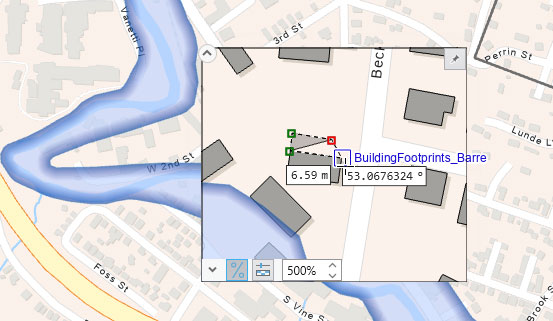在 2D 地图中,可以打开放大镜窗口以协助执行工作流,例如查看在较大比例下显示的内容以及在数字化新要素时使用精确捕捉。 在放大镜窗口中,支持用于导航、选择、测量和编辑的活动工具。