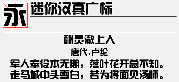 迷你汉真广标字体是一款十分有创意的中文字体,其字体方正而笔画转折处圆润,或有牵连,但笔画粗细一直,有其独有的特色,并字体的角度、大小、距离都设计得非常恰当,整体效果极佳,可以很好的应用于文本装潢、信息展示、网页设计、篆刻制模、数据制作、装潢设计、计算艺术设计、视觉设计、字帖等一切合法应用场景,有喜欢的朋友可免费下载收藏。