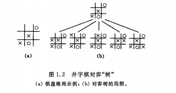 例 1-2 计算机和人对弈问题。计算机之所以能和人对是因为有人将对弈的策略事先已存人计算机。由于对弈的过程是在一定规则下随机进行的,所以,为使计算机能灵活对弈就必须对对弈过程中所有可能发生的情况以及相应的对策都考虑周全,并且,一个“好”的棋手在对弈时不仅要看棋盘当时的状态还应能预测棋局发展的趋势,甚至最后结局。因此,在对弈问题中,计算机操作的对象是对弈过程中可能出现的棋盘状态一一称为格局。例如图1.2(a)所示为井字棋的一个格局,而格局之间的关系是由比赛规则决定的。通常,这个关系不是线性的,因为从一个棋盘格局可以派生出几个格局,例如从图1.2(a)所示的格局可以派生出 5个格局如图1.2(b)所示而从每一个新的格局又可派生出 4 个可能出现的格局。因此,若将从对弈开始到结束的过程中所有可能出现的格局都画在一张图上,则可得到一倒长的“树”。“树根”是对弈开始之前的棋盘格局,而所有的“叶子”就是可能出现的结局,对的过程就是从树根沿树权到某个叶子的过。“树”可以是某些非数值计算问题的数学模型,它也是一种数据结构。