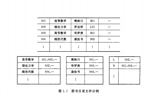例1-1 图书馆的书目检索系统自动化问题。当你想借阅一本参考书不知道书库中是否有的时候;或者,当你想找某一方面的参考书而不知图书馆内有哪些这方面的书时,你都需要到图书馆去查阅图书目录卡片。在图书馆内有各种名目的卡片:有按书名编排的,有按作者编排的,还有按分类编排的,等等。若利用计算机实现自动检索,则计算机处理的对象便是这些目录卡片上的书目信息。列在一张卡片上的一本书的书目信息可由登录号、书名、作者名、分类号、出版单位和出版时间等若干项组成,每一本书都有惟一的一个登录号,但不同的书目之间可能有相同的书名,或者有相同的作者名,或者有相同的分类号。由此,在书目自动检索系统中可以建立一张按登录号顺序排列的书目文件和 3张分别按书名、作者名和分类号顺序排列的索引表,如图 1.1 所示。由这4张表构成的文件便是书目自动检索的数学模型,计算机的主要操作便是按照某个特定要求(如给定书名)对书目文件进行查询。诸如此类的还有查号系统自动化、仓库账目管理等。在这类文档管理的数学模型中,计算机处理的对象之间通常存在着的是一种最简单的线性关系,这类数学模型可称为线性的数据结构。