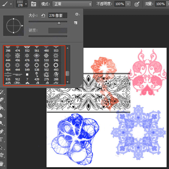 4、找到最后的画笔就是ps花形笔刷,有多种类别,用户可以调整大小直接放在图片上使用。