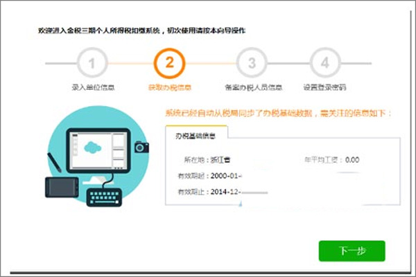 2、根据向导提示,先点击“下一步”进入办税信息的确认的环节和办税人员的信息登记,其中标红色*的部分为必填项,请确保信息准确无误。