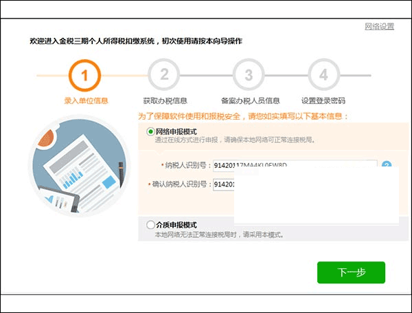 1、打开软件,首先录入单位信息,支持网络申报和介质申报两种模式;