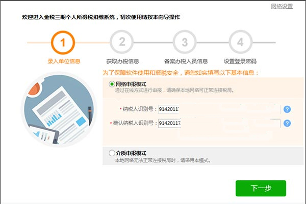 2、打开软件,首先录入单位信息,支持网络申报和介质申报两种模式;