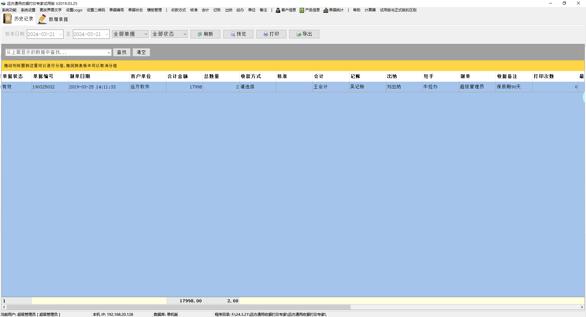 远方收据打印专家还支持批量打印功能,可一次性打印多张收据或者其他票据,这将有效的节省用户大量的宝贵时间,还可以实时生成单据编号,以便于用户对打印的票据信息进行查询或者管理,欢迎有需要的用户们免费下载体验。