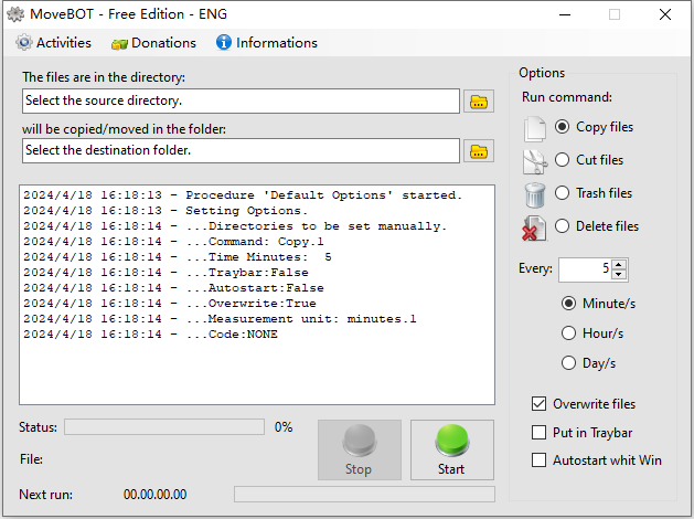 在使用电脑的过程中,我们经常会对一些重要的文件进行备份,从而保证数据的安全,但每次都手动复制粘贴太麻烦了,这里小编为大家带来了movebot免费版,这是一款实用的定时复制软件,其界面简洁,操作简单,支持对文件和文件夹进行定时复制,定时剪切,定时删除,定时移动等多种操作,用户只需设置好了间隔时间,只要时间到了,将会为用户提供定时操作,让你可以轻松同步文件和文件夹,提高工作效率。