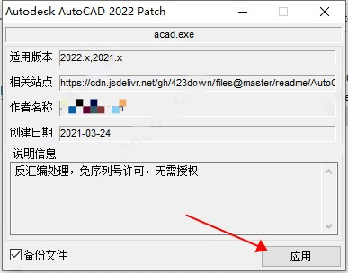 5、将autocad2022破解补丁文件,复制到软件的根目录下,也就是注册机复制过去,接着以管理员身份运行patch注册机,点击应用;