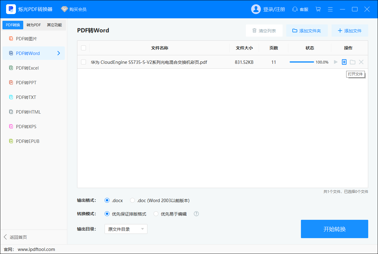 4、等待转换进度到达100%之后,PDF转Word就完成了,点击打开即可查看文件。