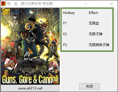 枪血意大利黑手党修改器是针对横版动作冒险游戏枪血意大利黑手党(Guns, Gore & Cannoli)量身打造的一款辅助修改软件,能够为玩家快速提供无限血、无限子弹、无限特殊子弹等三项最基本的功能,从而帮助用户大幅度降低游戏带来的难度,大家有需要就可以来下载吧。