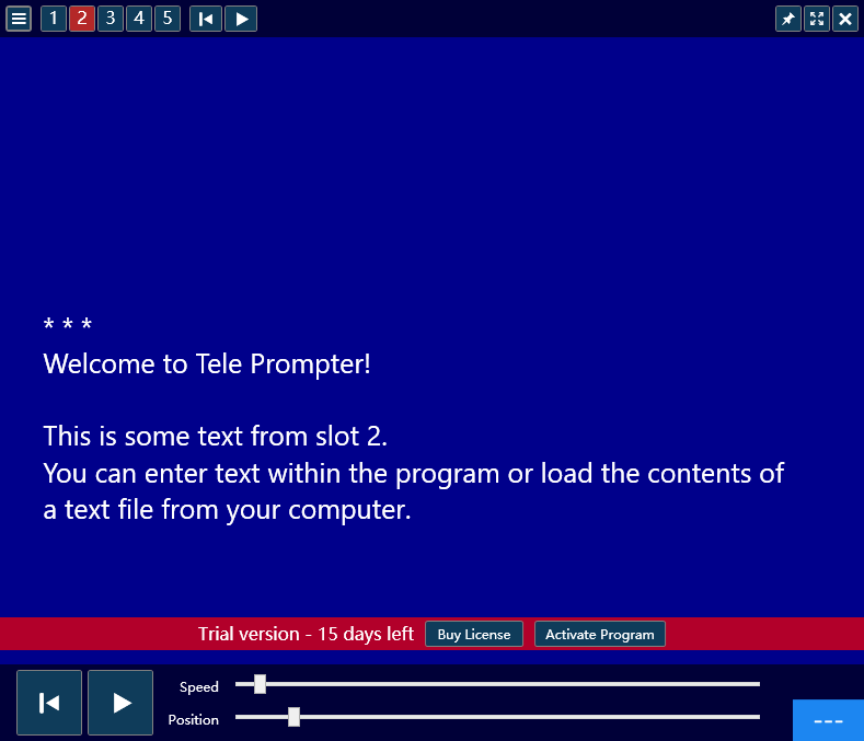 TelePrompter是一款在窗口或全屏模式下平滑滚动文本的工具,可调整窗口大小,选择背景和文字颜色、字体、行高、对齐和边距。支持三个文本插槽,显示当前滚动文本的已用百分比,从而及时调整文本速度变化。TelePrompter是一款易于使用的现代化强大文本、演示文稿桌面滚动器,具有最新的编程技术(Microsoft .Net 4 / WPF),可以为计算机的GPU(图形处理单元)加速,进而提高用户体验。软件小巧,简单,性能稳定,有兴趣的可以下载。