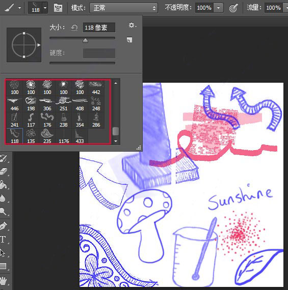 4、找到最后的画笔就是ps涂鸦笔刷,有多种类别,用户可以调整大小直接放在图片上使用。