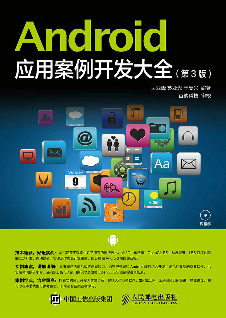 android应用案例开发大全第三版是一本毕业设计、项目实战、商业开发的案例参考指南手册,由吴亚峰、苏亚光和于复兴三人共同编著。本书技术新颖,贴近实战,涵盖了现实中几乎所有的流行技术,如3D、传感器、OpenGL ES 2.0、动态壁纸、LBS百度地图的二次开发、移动办公、实时流体仿真计算引擎、服务端和Android端的交互等内容,并且全书以真实的项目开发为讲解背景,包括大型商务软件、3D游戏等,无论做项目还是进行毕业设计,都可以在本书找到相同的案例,非常适合各类读者学习。