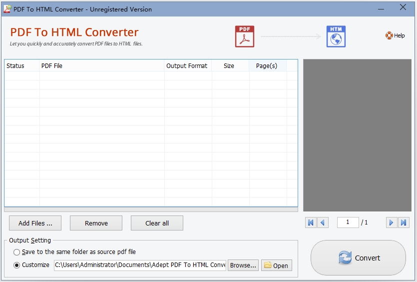 pdf to html converter官方版是一款专业的pdf转html转换器,这款软件可以让您对添加好的pdf文件进行管理,可移除与清理,设置保存路径,而且也可以将外部字体转换成文本和嵌入字体到图像中,其支持Windows XP、2003、WindowsVista、Windows 7和Windows 8等,非常方便快捷。另外,pdf to html converter可以将PDF文件转换成一个连续的HTML页面,也可以自动调整图片大小以适应框架边框,非常实用,有需求的用户快来下载体验吧!