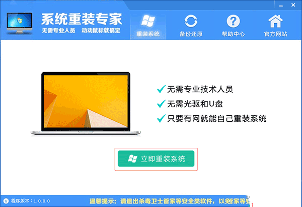 第一步:打开系统重装专家,安装好。点击立即重装系统,建议退出杀毒卫士管家等安全类软件,因为涉及重启,部分杀毒软件会拦截造成系统安装失败哦。