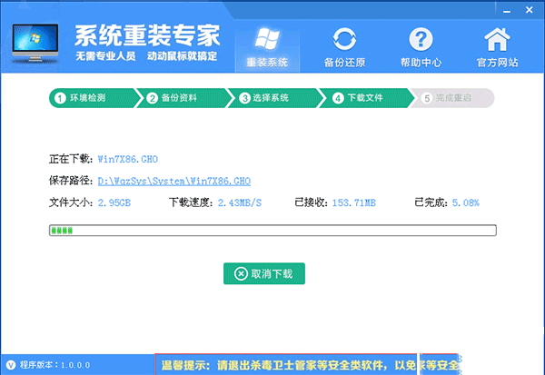 第五步:系统正在下载,中间无需您的任何操作,系统会全自动安装完成,一个全新清爽的系统安装成功,无需您花一分钱。