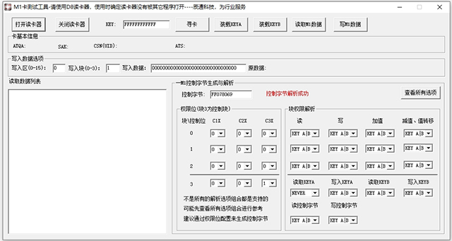 支持 S50 标准的 M1 卡的读写功能,目前程序支持使用 D8 读卡器,用户使用本工具时,请确保 D8 读卡器没有被其它程序打开使用;工具还包含有 SAK 注释功能。