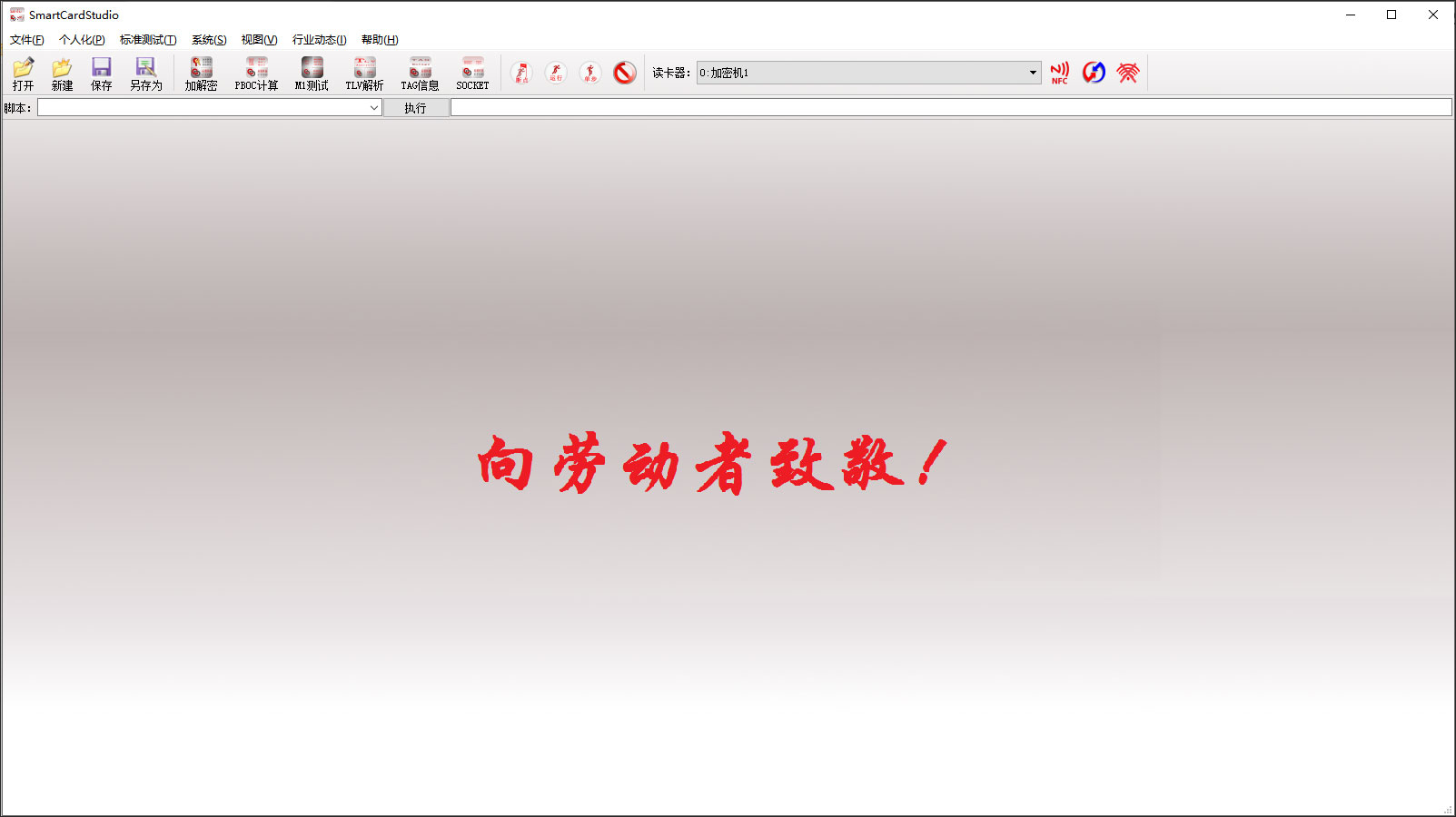 系统工具栏提供常用工具按钮,包括脚本打开、脚本新建、脚本执行、读卡器选择、读卡器操作、常用辅助工具等,鼠标移动到按钮上可以获得相应的提示信息