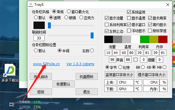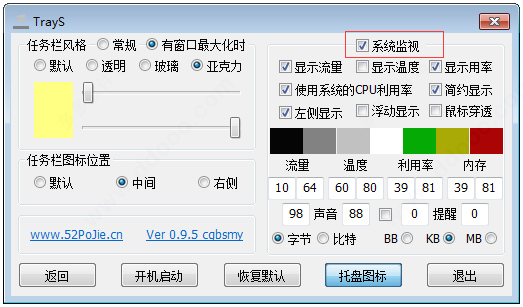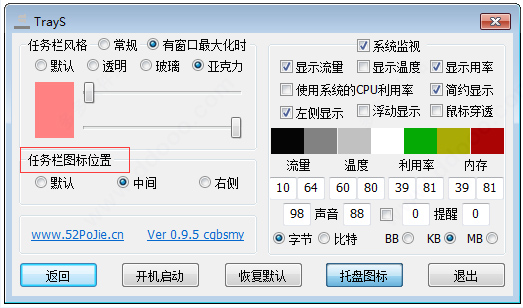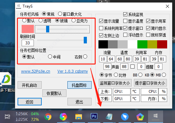 想设置下自己的电脑任务栏吗?那么可以利用trays软件来试试,这是一款专门为win10系统而提供的任务栏美化软件,是由吾爱论坛中的cgbsmy网友制作推出的,通过它不仅可以随意的设置出透明效果、玻璃效果、亚克力效果等风格的任务栏,还能自定义设置任务栏颜色、托盘图标、任务栏图标位置等操作,从而即可更好的为你打造出个性化任务栏。另外,trays软件还提供了流量、CPU、内存、温度等数据监控实时显示,同时用户还可以根据自己的习惯来自定义设置数据以字节、比特、BB、KB、MB等任意模式来显示,功能十分丰富,而且软件十分小巧简洁,大小仅仅只有几十K,欢迎有兴趣的用户们免费下载体验。