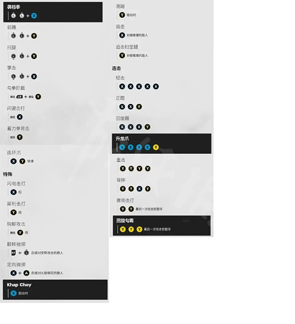 2、【Y键】——Y、长按Y(蓄力拳背击)、下上Y(扫腿)、上上Y(前踢)、格挡后Y(犀利打击)、奔跑时Y(滑踢)、对被推搡敌人Y(追击扫堂腿)