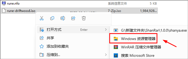 1、在本站下载解压到非中文路径下,鼠标右键“rune-driftwood.iso”漂流木镜像文件,选择打开方式为“Windows资源管理器”;