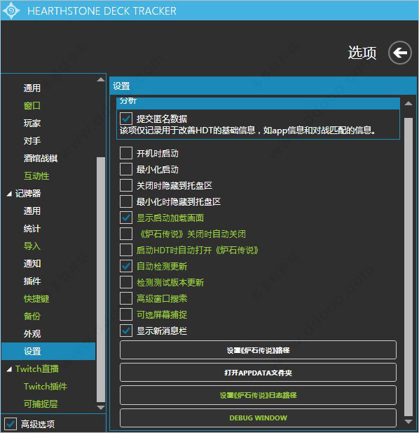 9、最后的总设置包括开机启动,启动最小化等等,比较有用的是设置炉石路径,设置炉石LOG路径等,可以解决大部分用不了的问题。比如log文件无法读取,就去用管理员权限打开HDT,删掉原来的log文件再重设路径一般就好了。