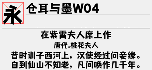 仓耳与墨W04是一款个性化的字体,由仓耳字库推出。它的设计融入了篆刻的“刀意”,笔形看起来像是被刀刻出来的,整体感觉端正又有视觉吸引力。这款字体适合多种应用场景,比如网页设计、装潢设计甚至篆刻制模等,用途很广。