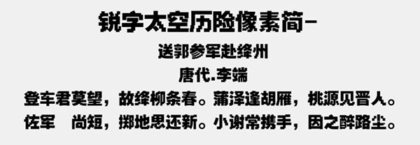 锐字太空历险像素简字体是由锐字潮牌字库出品一款新颖的中文字体,该字体笔画较粗。规范、工整,容易辨认,其中部分笔画是利用小方块像素点组成,完美体现科技感和现代感,可以很好的应用于文本装潢、信息展示、网页设计、篆刻制模、数据制作、装潢设计、计算艺术设计、视觉设计、字帖等一切合法应用场景,有喜欢的朋友可免费下载收藏。