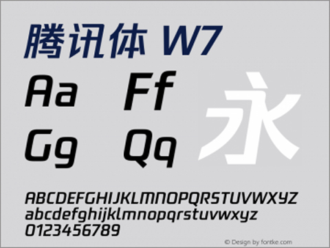 腾讯体(TTTGB-Medium)是腾讯官方发布的一款全新字体,一般又称为腾讯logo体,该新字体更现代、更协调、更动感,全是斜体,连倾斜的角度也经过各种各样的实验,汉字的视觉倾斜度为8°,辅以一定的视觉修正,内白设计成平衡均匀,中宫也是以平均为主,确保能够像其他中文字型般使用。为了配合中文,腾讯字体中的拉丁文字的视觉倾斜度为10°,整体字体效果出众,自带动感和速度感,欢迎免费下载体验。