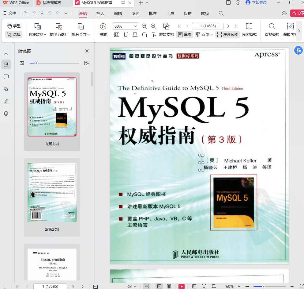 这本书《MySQL5权威指南(第3版)》是一本非常实用的数据库学习书籍,由科夫勒和杨晓云合著。内容涵盖了MySQL 5.0的基础知识到高级功能,适合数据库管理员和开发人员阅读。书中不仅详细讲解了MySQL的安装、配置和管理,还介绍了如何使用PHP、Perl、Java等多种编程语言与MySQL交互,并提供了大量实际案例供读者练习。