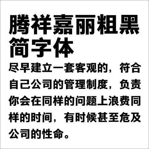 这款腾祥嘉丽粗黑简体字体看起来挺有意思的,是腾祥字库新推出的一款传统黑体字。它的设计风格挺特别的,横竖笔画没有衬线装饰,还融入了一些英文元素,感觉挺时尚简洁的。字型很端正,重心平稳,布白均匀,笔画也比较粗壮,整体看起来醒目又大气。