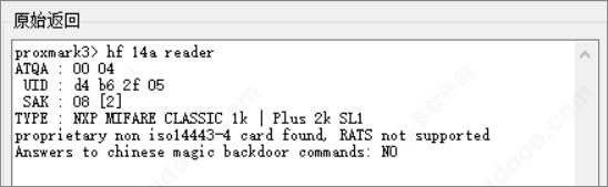 5、高频天线电压下降非常明显,这就说明我们现在所持有的卡片为高频IC卡,下面尝试对器破解,首先先读取卡片类型。