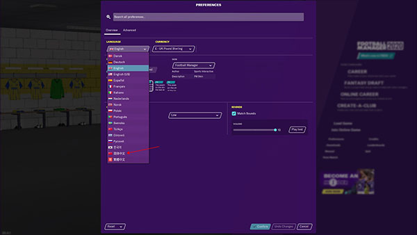 4、在language这一栏中,往下拉找到简体中文,选择confirm,就可以将游戏设置为中文了;
