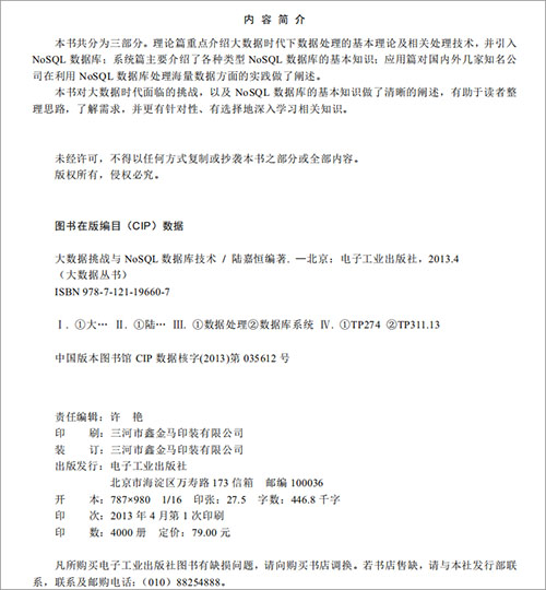 大数据挑战与nosql数据库技术是一本NoSQL数据库数据操作手册,由陆嘉恒编著。本书内容丰富翔实,主要从理论、系统、应用三个方面详细讲述了大数据的技术知识,并针对NoSQL数据库技术做了深入的分享,是学习大数据技术的地图、指南手册,可以帮助读者跳出迷局,厘清思路,系统地做好相关知识储备,拥抱大数据时代!