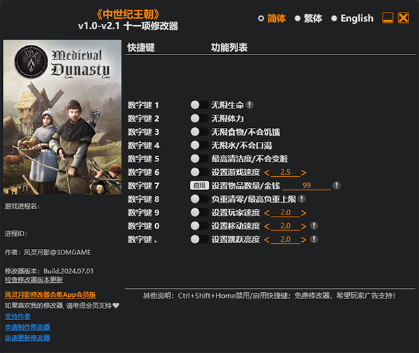 中世纪王朝修改器风灵月影是专为中世纪王朝游戏修改所打造的一款非常实用的属性修改器,而中世纪王朝是一款开放世界冒险类游戏。在游戏中玩家可以通过发展经济来建设你的王朝,发展经济则是需要玩家耗费大量的时间和精力。玩家想要获得更为轻松的游戏体验则是需要通过修改器来一键实现。在这里通过中世纪王朝修改器风灵月影可以轻松实现。且软件操作起来极为便利,不需要玩家进行各种前置要求才能使用,双击打开软件立刻就能使用。保证玩家能立刻享受到轻松的游戏环境。对此,有需要的玩家快来本站免费下载体验吧。