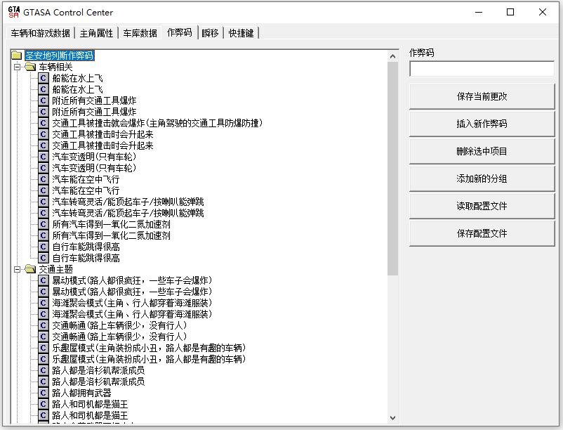 gtasa control center中文修改器是针对《侠盗猎车手:圣安地列斯》游戏推出的一款绿色免费,功能非常强大的超级变态修改器,一般又称为侠盗猎车手圣安地列斯超强修改器,其修改属性数量极其丰富,可以提供多项修改功能,包括:常用密籍,人物状态,交通工具,车辆状态,时间天气,瞬移操作,清除修改记录,保存录像等等,几乎可以满足游戏者的所有需求,非常的变态,后文附有详细的解释说明以及操作方法,上手很简便,如果您是侠盗猎车手玩家,欢迎免费下载收藏。