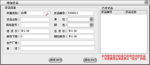 在货品信息这一部分输入新增货品的所有信息,点击“保存”按钮即可把该货品保存到右边的已存货品中,保存后可以继续输入下一种货品。在“已存货品”中可以点击鼠标右键对选中的货品进行删除或删除全部已存的货品。如果货品增加完后可以直接点“退出”按钮。退出增加货品窗口后会在货品列表中看刚才增加的货品。如果要修改货品,先选中要修改的货品,点击“修改”按钮打开货品修改界面,在货品修改界面中修改相应的信息点击“保存”即可。点击“删除”按钮即可以把选中的货品删除,该货品发生过业务则是不能删除的。