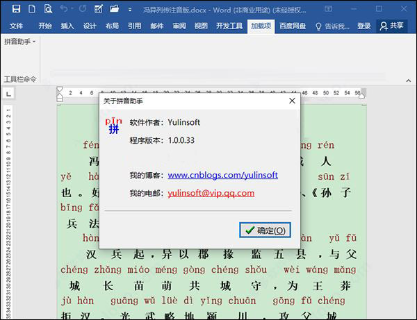 拼音助手不仅提供了一键汉字注音功能,还提供了彩色拼音、拼音组合、去音留字、去除声调等功能以供使用,并为了更好的调节汉字的多音字,特支持用户自由利用软件来调节声调,非常贴心。另外值得一提的是,这款文档加拼音工具是由Yulinsoft网友自制分享的,不但完全免费,还无广告无病毒,可放心随意使用,并微软word2003-word2016都能任意安装使用,欢迎有需要的自行下载体验。