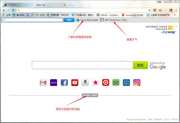 6、点击SHOW/HIDE则可以使用InternetSpeedTracker插件的网速测试功能、听收音机、打开游戏网站以及跳转至上文提到的有关网速提高的文章。
