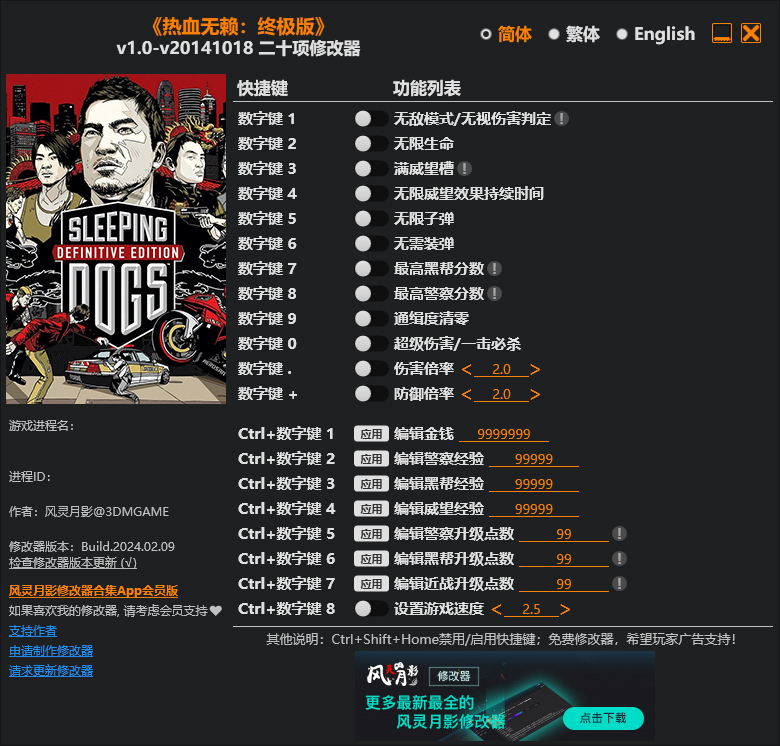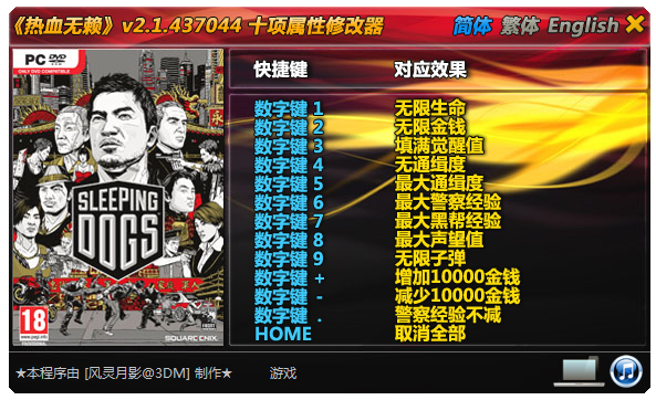 热血无赖修改器风灵月影版功能列表: