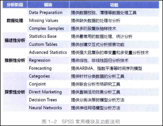 根据SPSS模块功能的不同,可以将SPSS常用模块大致划分为四个分析阶段:数据处理、描述性分析、推断性分析和探索性分析,各分析阶段对应的具体模块如图1-2所示。