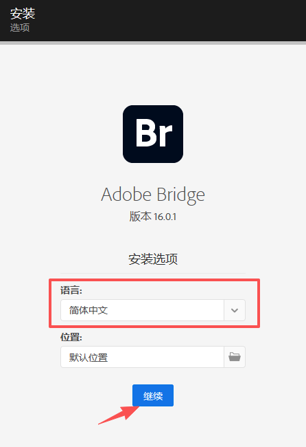 2、选择软件语言,安装位置选择默认即可,随后点击屏幕下方的“继续”。