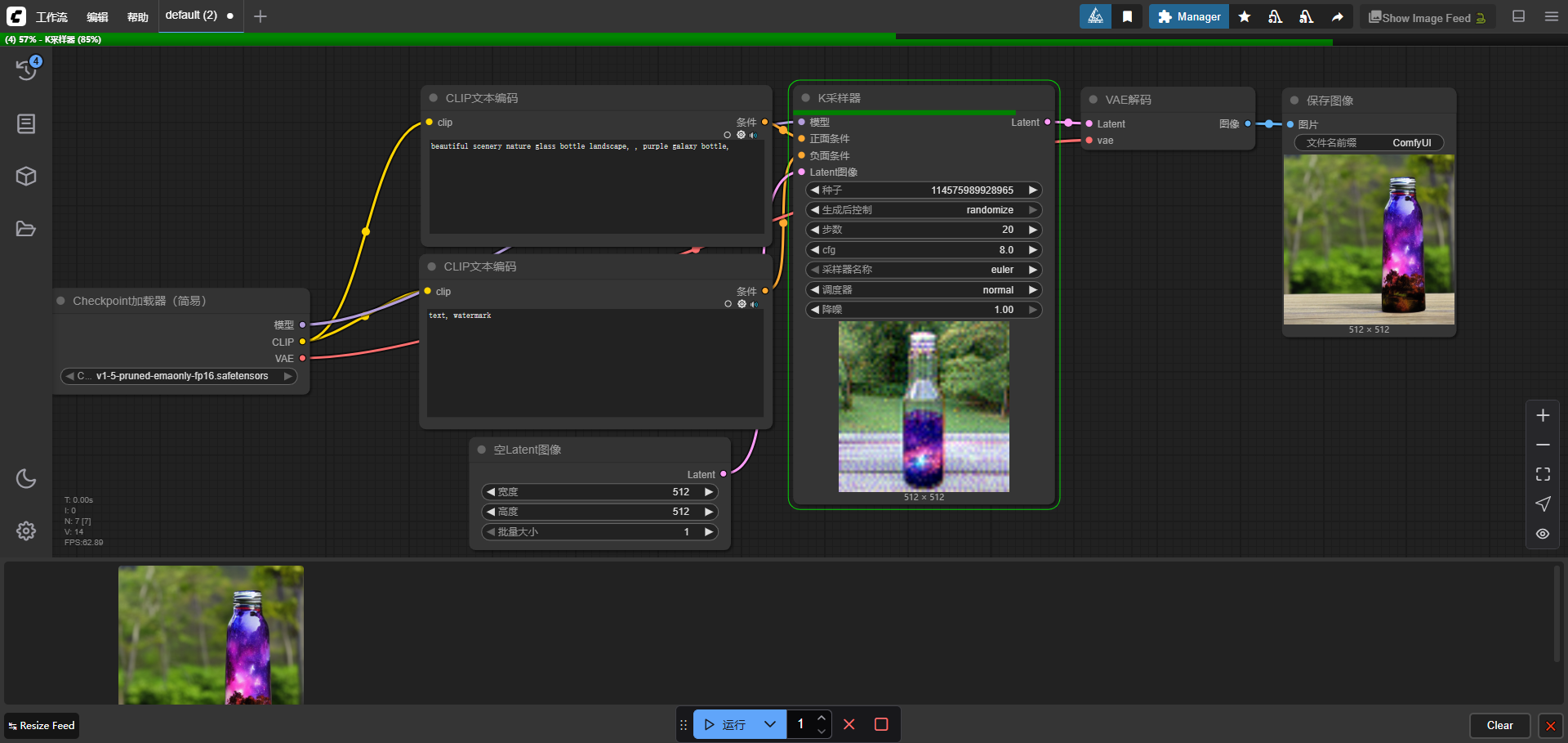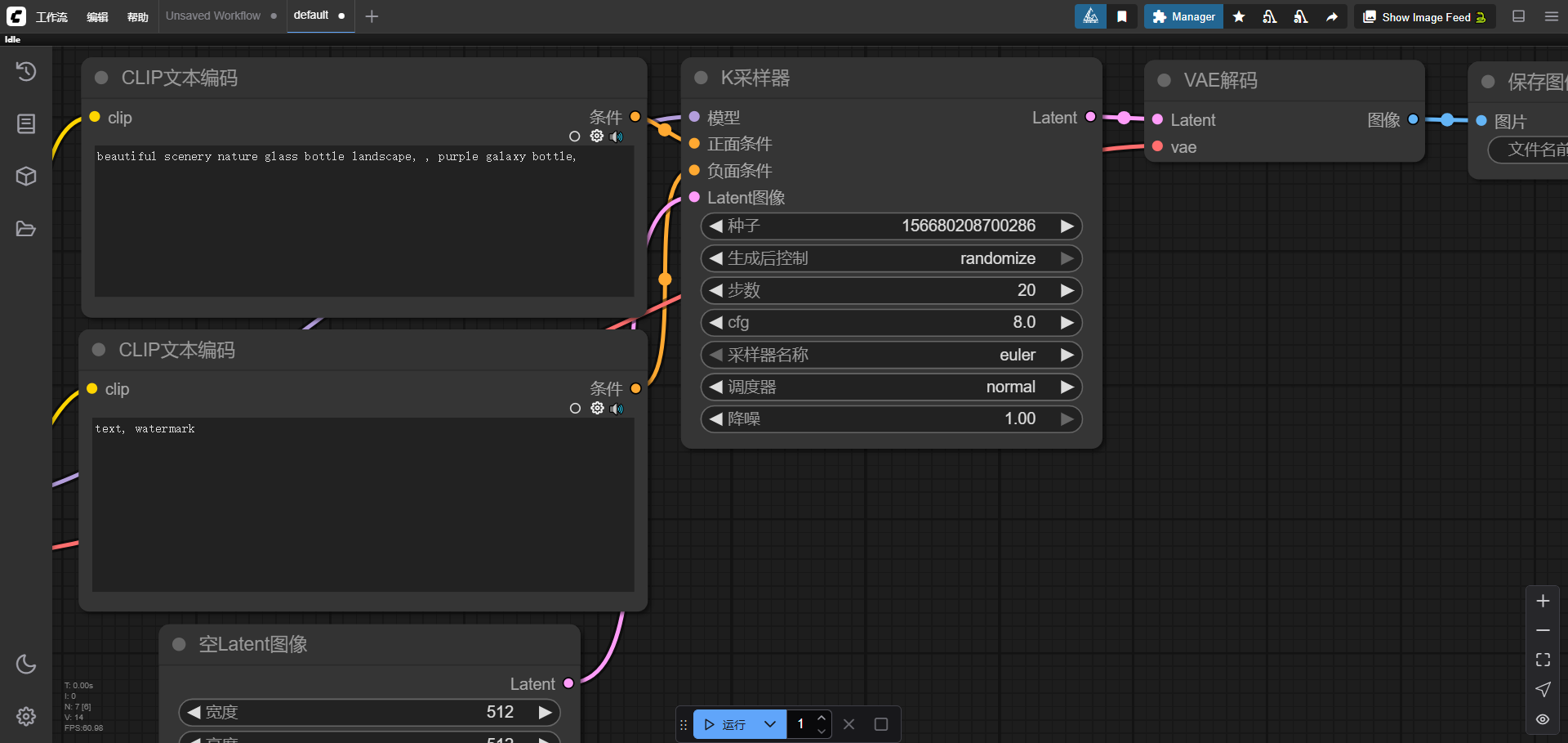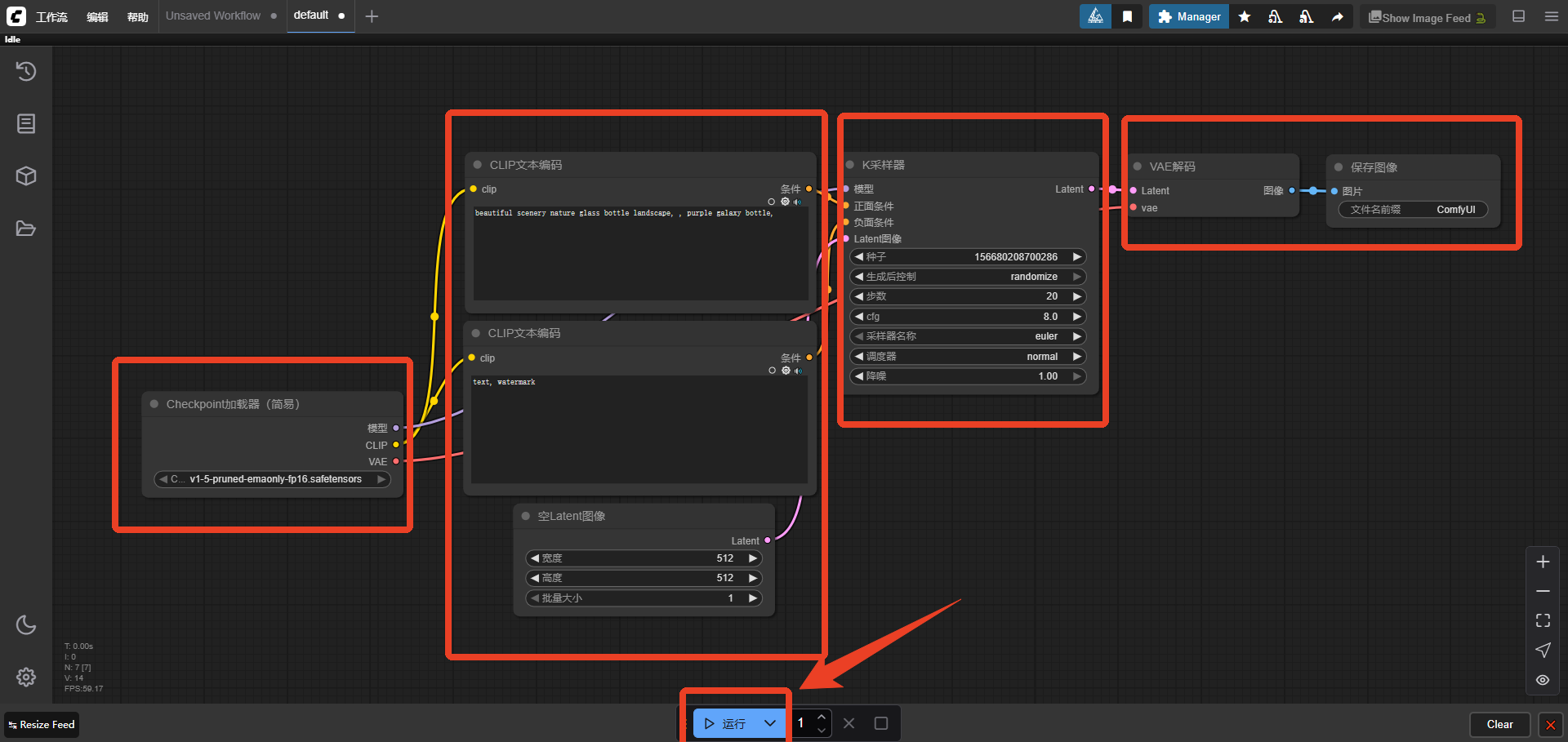 12、基本的文成图流程就是在最左边调节加载模型,然后是图像分辨率、采样器等设置,所有都调节好后就能点击下方的【运行】了。秋叶ComfyUI整合包里除了有启动器还有一些其他的资源,大家可以自行下载和导入。