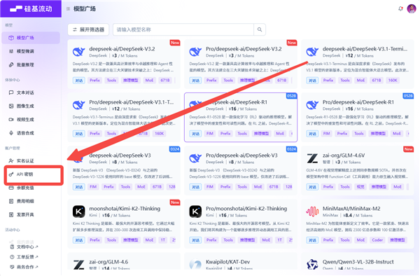2、进入后,左侧导航栏点击【API密钥】。